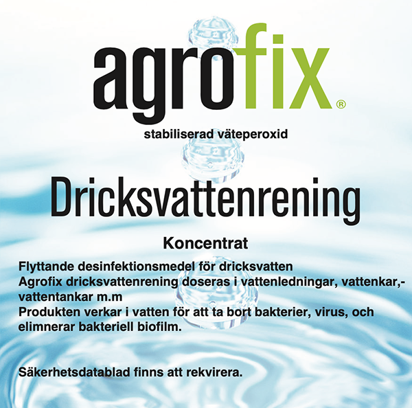 Det behövs inga kompletterande produkter till Agrofix. Rätt hanterat klarar systemet av allt ifrån vattenrening, rengöring och desinficering av mat koppar, verktyg, maskiner och utrymmen. Agrofix går att köpa på fat i högre koncentrationer, ned till sprayflaskor med lägre koncentration för direkt användning i exempelvis personalutrymmen.
