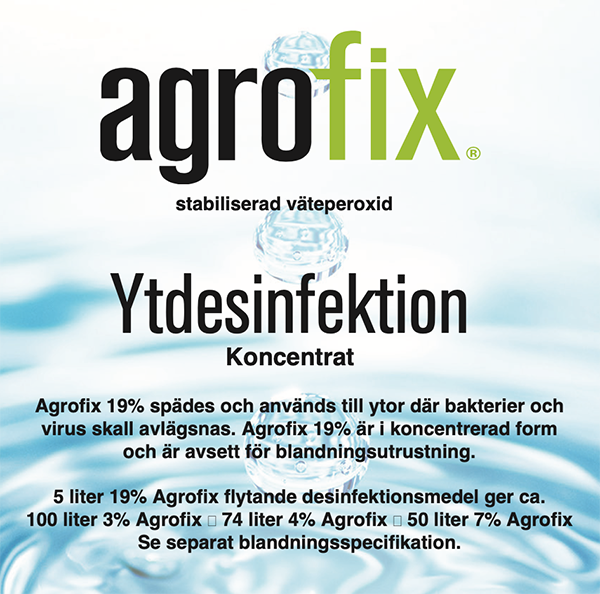Agrofix är ett helt nytt system för att hålla sjukdomsalstrande bakterier, virus, parasiter och andra mikroorganismer borta. Resultatet är lägre dödlighet och kassationer, vilket i sin tur ökar gårdens lönsamhet. Även själva arbetet med rengöring och desinficering av stallarna underlättas eftersom Agrofix kräver mindre noggranna förberedelser.