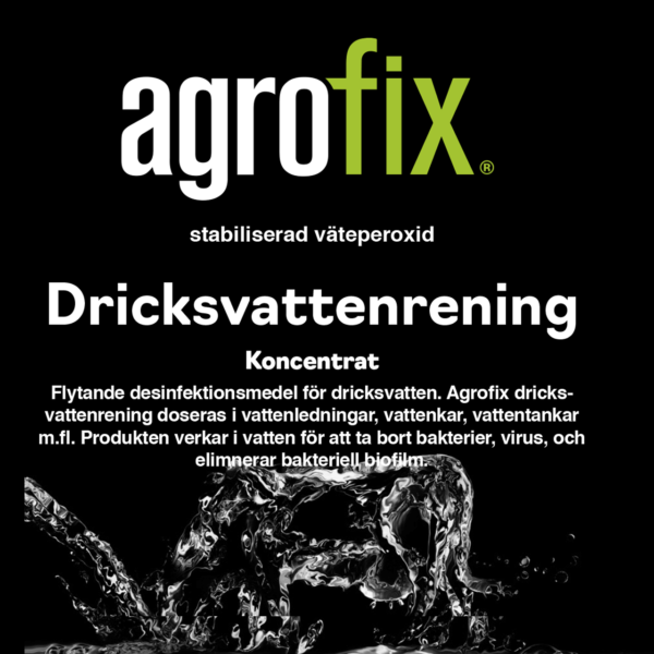 Flytande desinfektionsmedel för dricksvatten. Agrofix dricksvattenrening doseras i vattenledningar, vattenkar, vattentankar m.fl. Produkten verkar i vatten för att ta bort bakterier, virus, och elimnerar bakteriell biofilm.